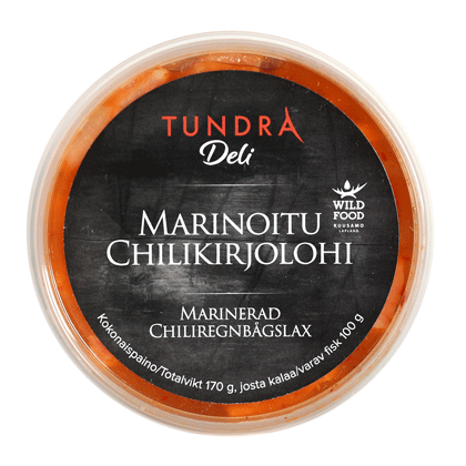 kotimainen kirjolohi, vesi, etikka, suola 1,5 %, sokeri, chili, mustapippuri, sipuli, savuaromi.